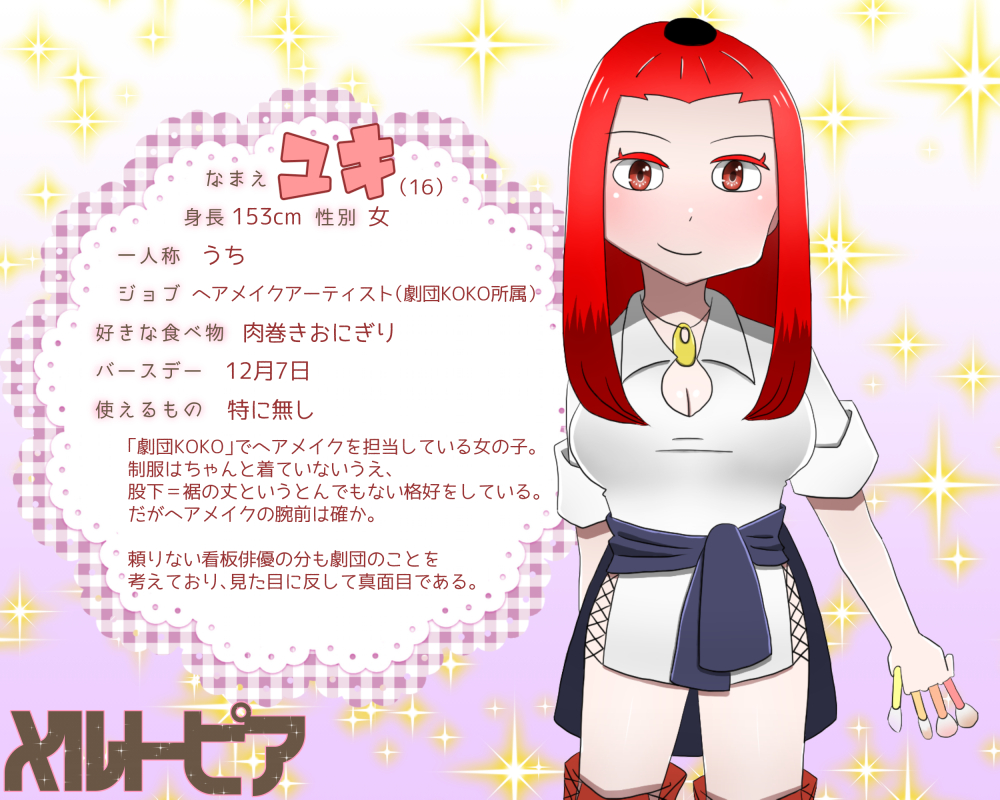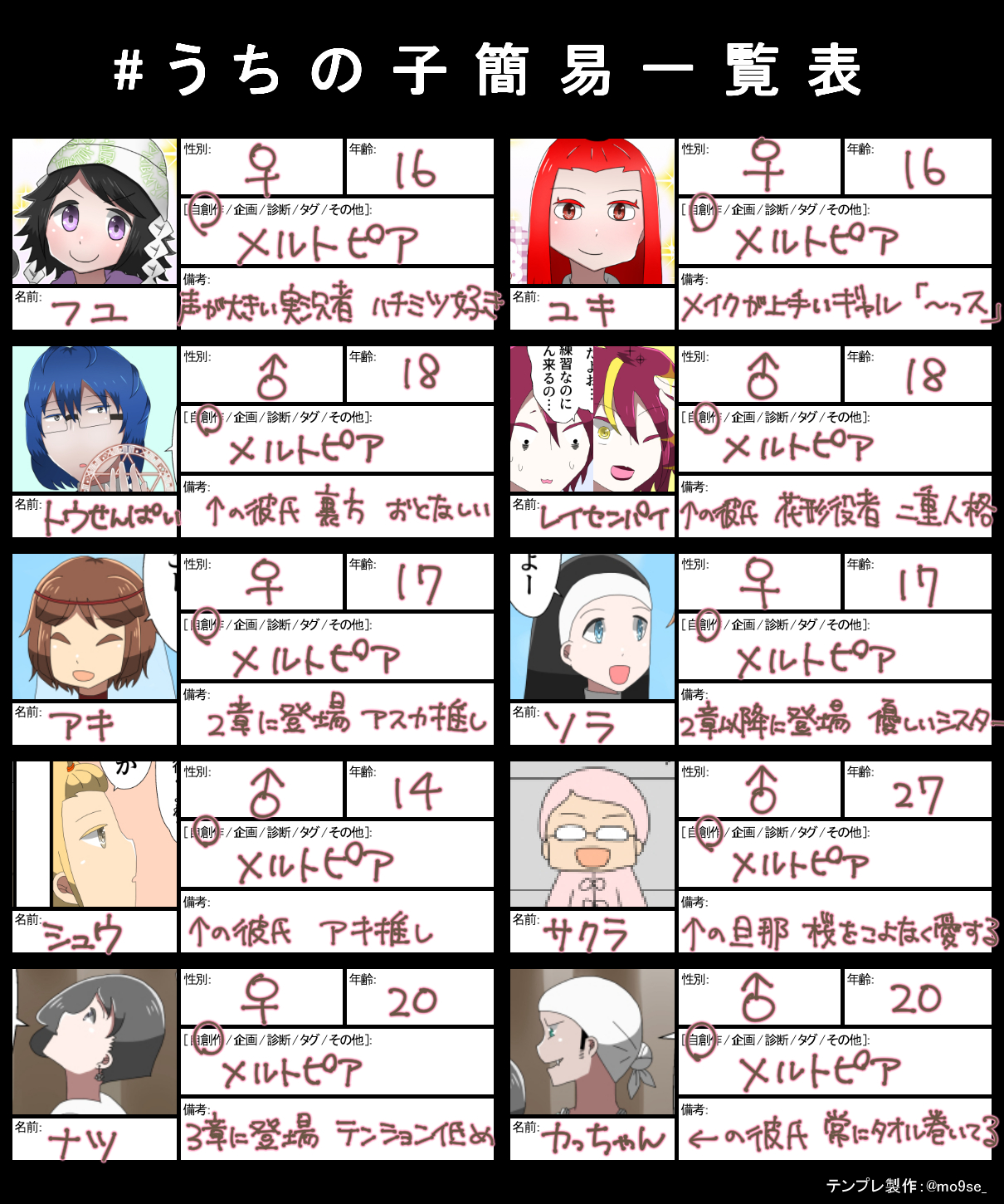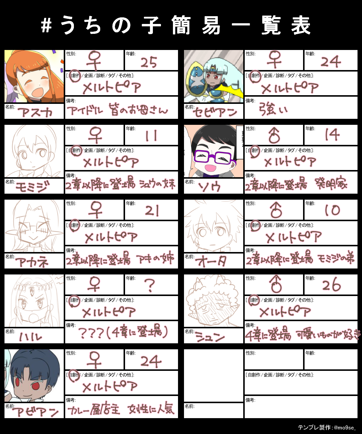[PR] ×[PR]上記の広告は3ヶ月以上新規記事投稿のないブログに表示されています。新しい記事を書く事で広告が消えます。 【メルトピア】1話 1ページ目7コマ目、うえうえ.jp宅の踊場ウタコちゃんお借りしました PR 【メルトピア】ユキのCS 【メルトピア】フユのCS 【メルトピア】キャラ簡易一覧表 テンプレをお借りして作成した、メルトピア登場キャラの簡易一覧表です。 この先キャラが登場した時に更新するかもしれません。